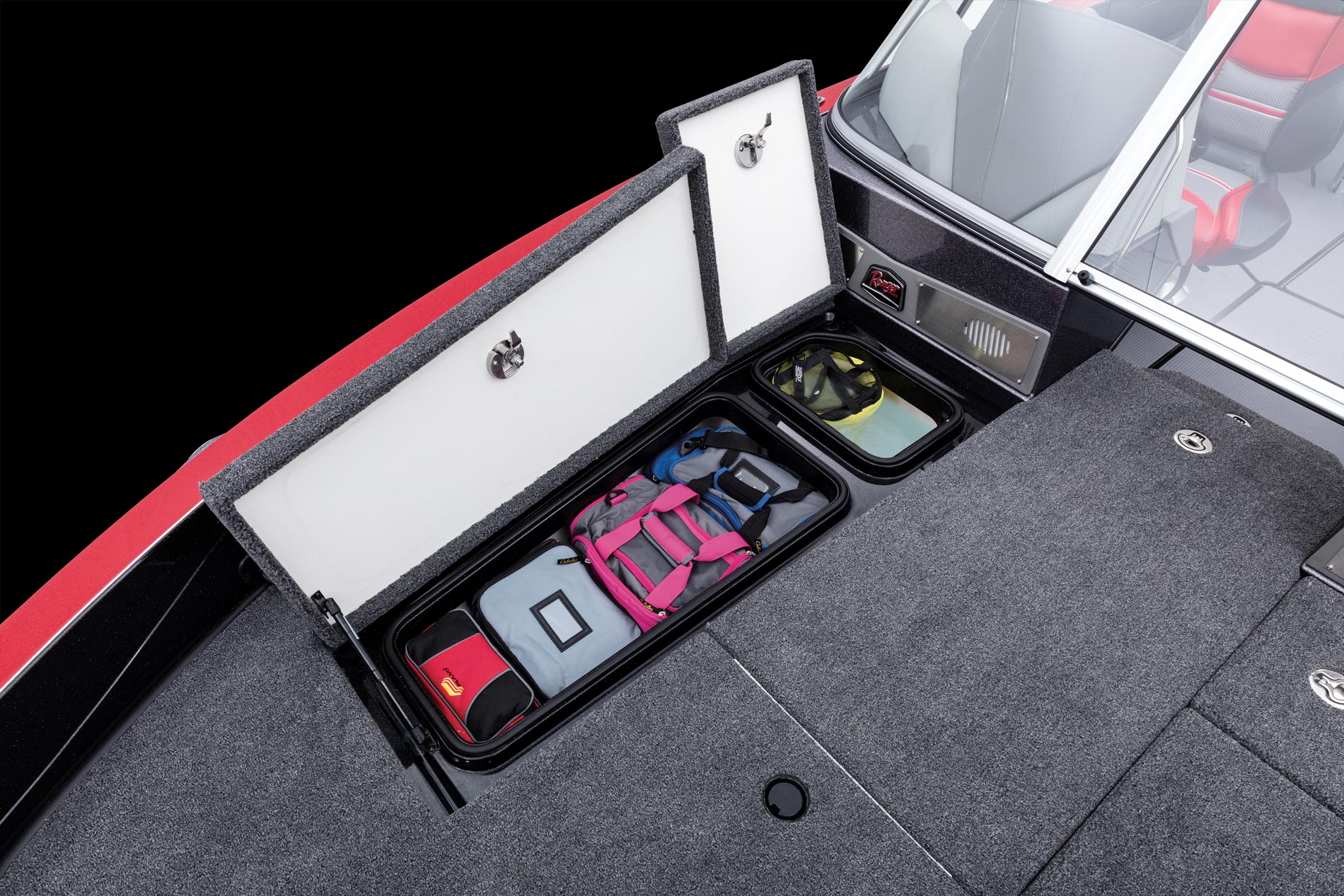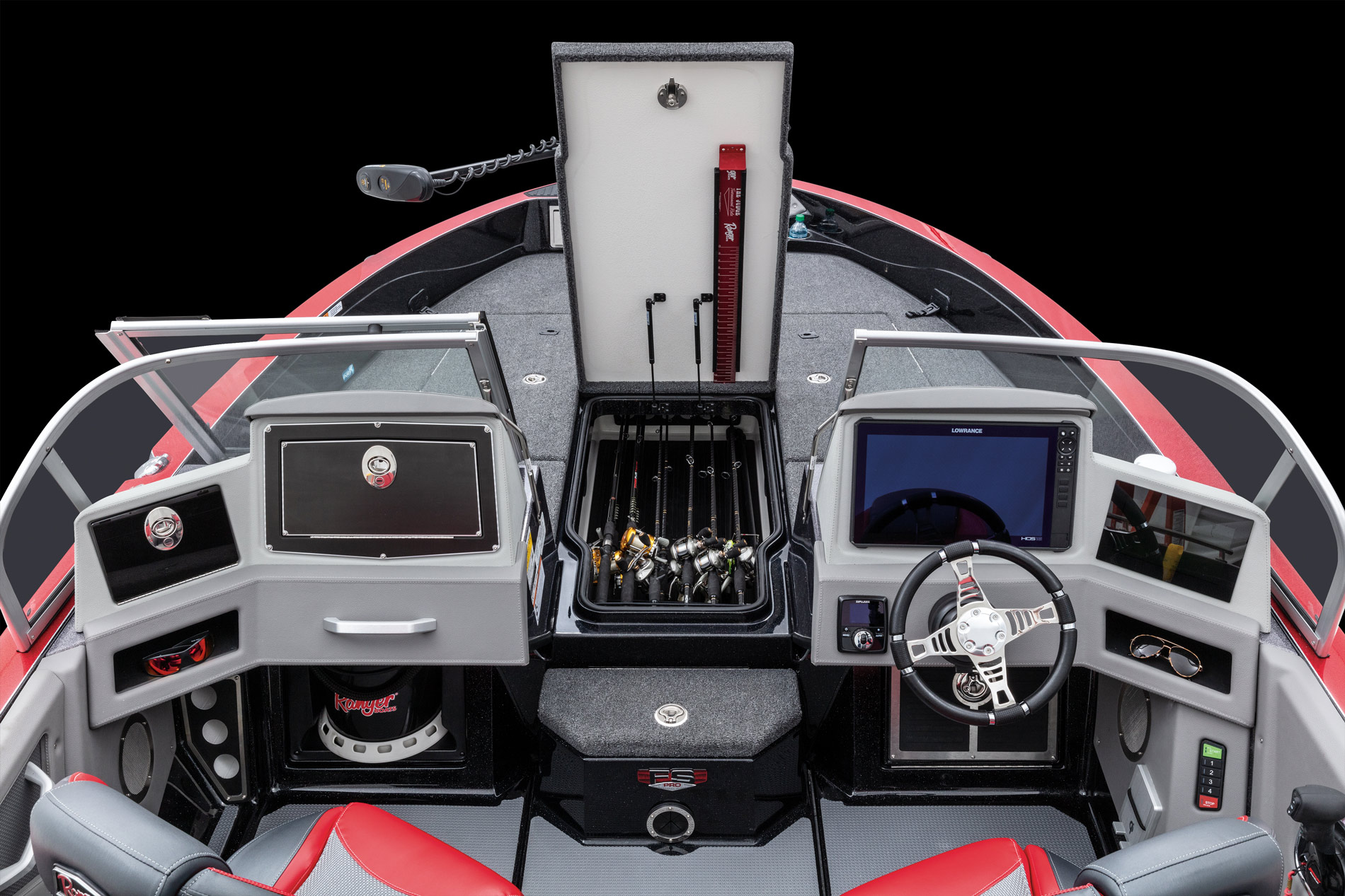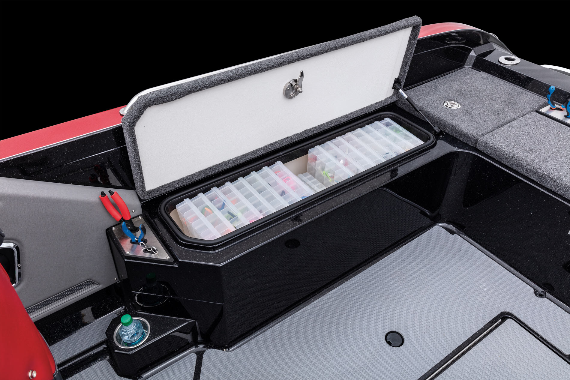 Inside, a full non-skid cockpit boasts the largest storage capacity we’ve ever featured in a 21-foot Deep V. Store dozens of tackleboxes in the saddle stows and scores of rods up to 8’6” in the lockable center and port rod boxes. Twin passenger glove boxes and a driver’s footrest storage keep essentials hidden and dry while multiple tool and cup holders keep other necessities handy.