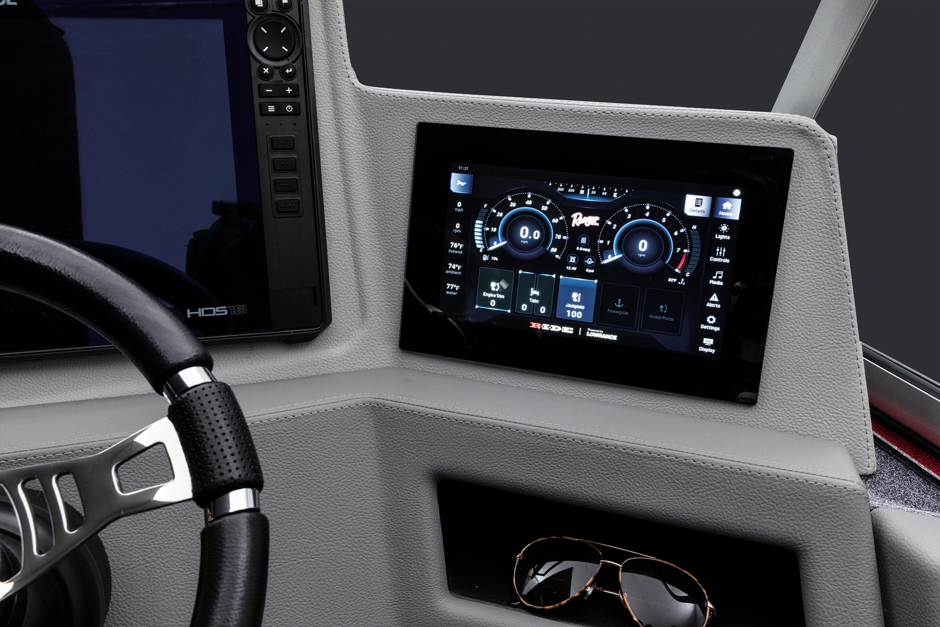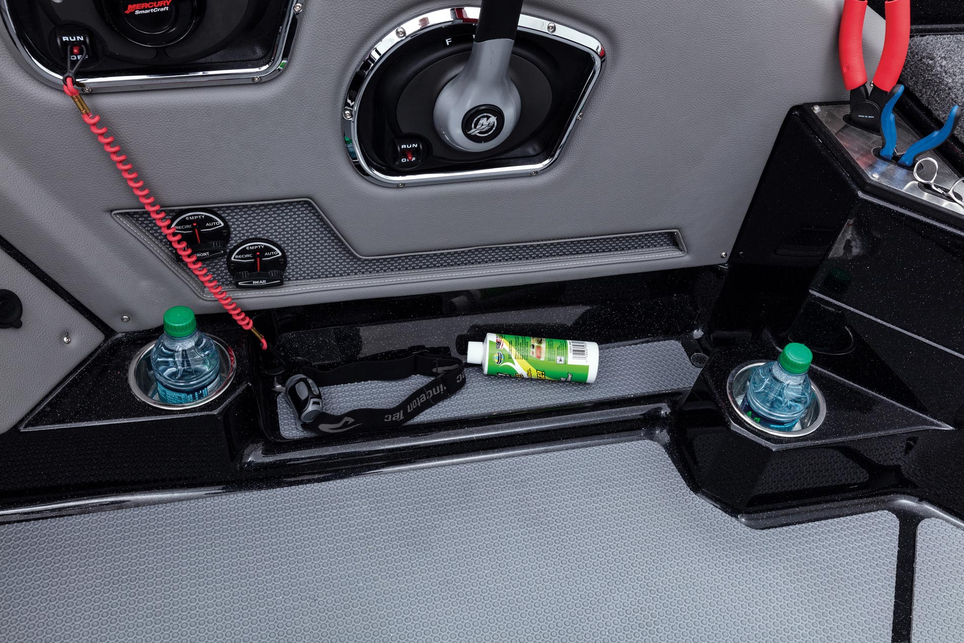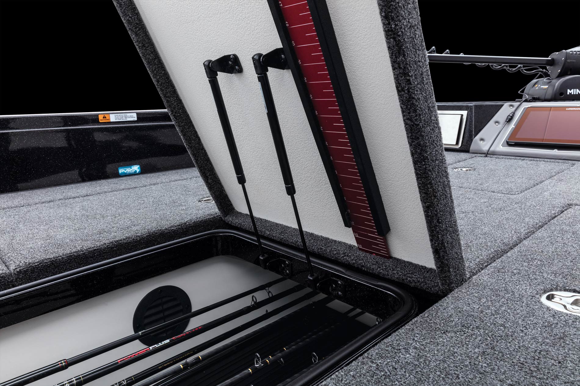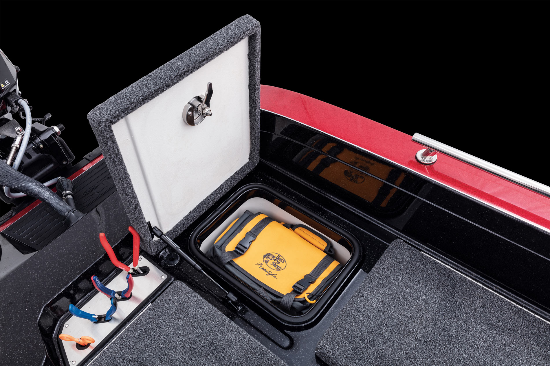 Inside, a full non-skid cockpit boasts the largest storage capacity we’ve ever featured in a 21-foot Deep V. Store dozens of tackleboxes in the saddle stows and scores of rods up to 8’6” in the lockable center and port rod boxes. Twin passenger glove boxes and a driver’s footrest storage keep essentials hidden and dry while multiple tool and cup holders keep other necessities handy.
