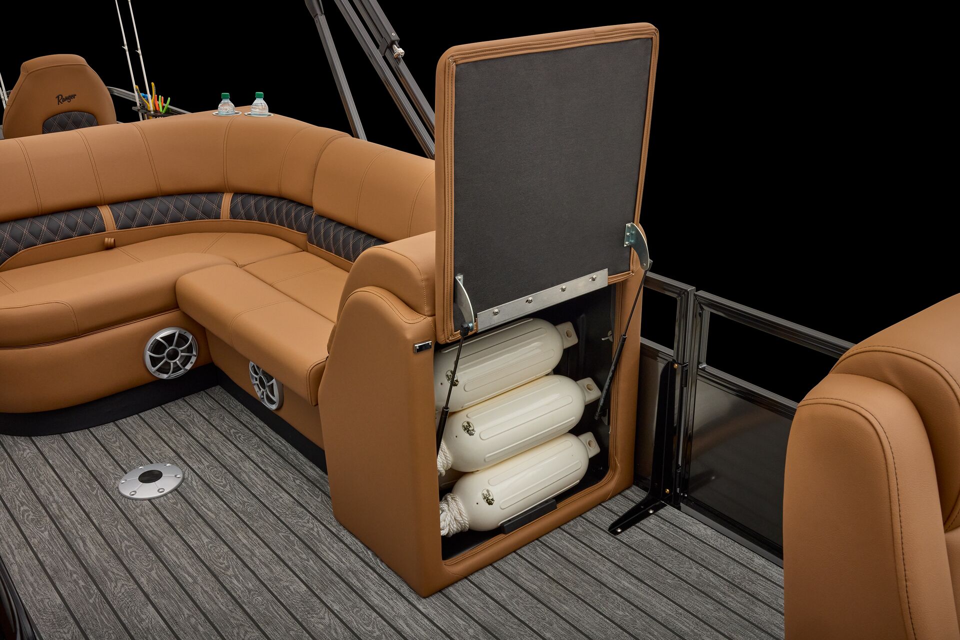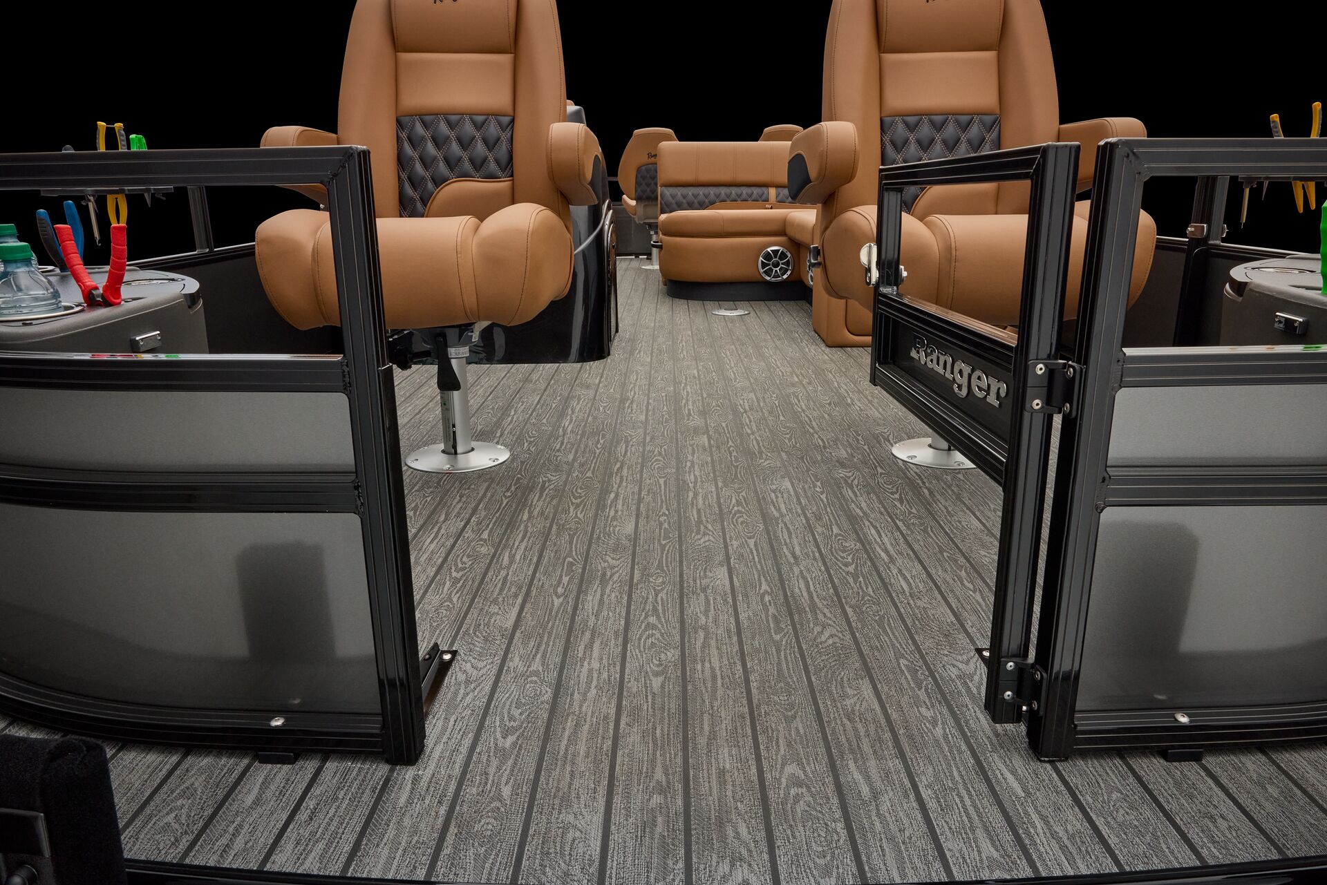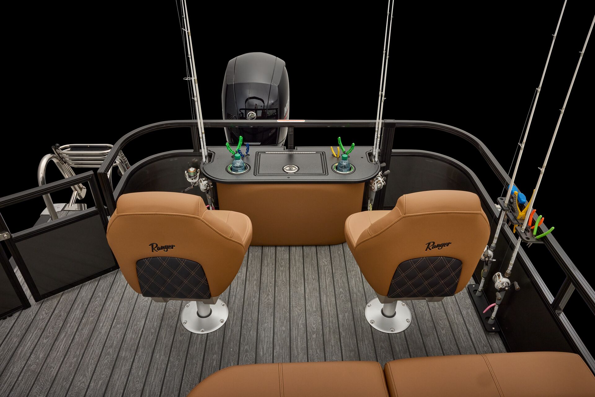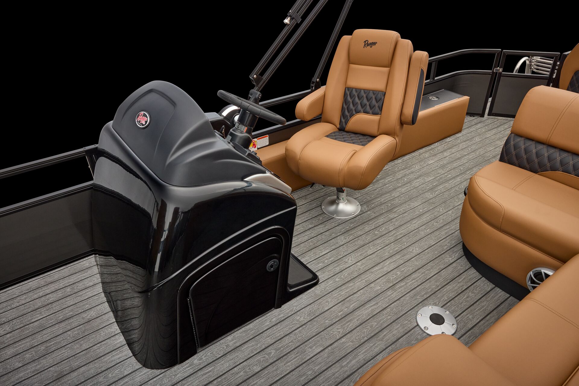 Whether the urge to fish strikes, you want a machine that’ll fit your whole crew and all your gear. The Ranger 220F is a fishing-first pontoon that’s loaded with all the fishing necessities and doesn’t skimp on creature comforts. Every inch of this all-in-one pontoon has something for everyone. For fishing features, fore and aft fishing stations feature livewells, rod and tool holders, and plush, premium seats. The front are captain's chairs with self-leveling arms that swivel 360 degrees. An optional trolling motor lets you sneak up in the shallow where lunkers lurk. A lockable rod box stows your sticks securely out of the way, but ready to go at a moment’s notice.